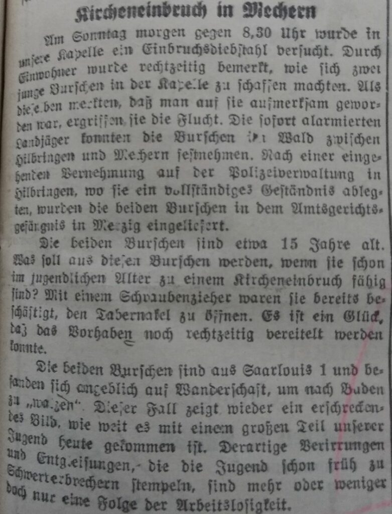 Start » Uncategorized » Kircheneinbruch in Mechern 1932 Kircheneinbruch in Mechern 1932 12. Dezember 2022 valgard Uncategorized Kircheneinbruch in Mechern 1932 1 März. MVZ Bürgerarchiv Merzig Views: 0