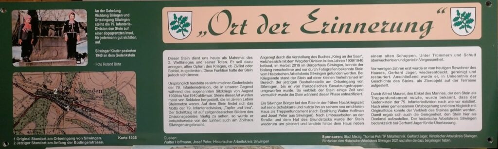Es handelt sich um einen Stein den die 79. Infanterie Division, die am Anfang des 2 Weltkrieges während des sogenannten Sitzkrieges hier stationiert war am Ortseingang von Silwingen an der Bushaltestelle auf einer kleinen Verkehrsinsel aufgestellt hatten.