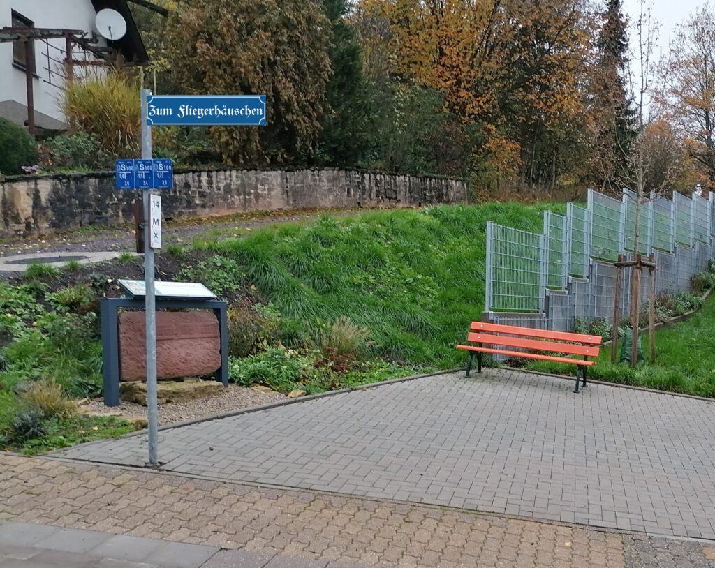 (Das erste Foto zeigt ein Schild mit der Aufschrift „Beim Fliegerhäuschen“. Dieser Name wurde damals als Vorschlag für den Platz eingereicht, jedoch vom Ortsrat abgelehnt. Die Bezeichnung stammt von einem Behelfsheim aus dem Zweiten Weltkrieg, das sich oberhalb befand und von den Silwingern stets „Fliegerhäuschen“ genannt wurde. Wir hielten den Namen für passend, da der Platz bis heute keinen offiziellen Namen hat.)