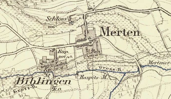 „Bolchen, 21. April. — Das bei Merten liegende, sogenannte Mertener Schloß der Komtesse Madame de Coetlosquet ging zum Preise von 64 000 M. in den Besitz des Holzhändlers und Restaurateurs Baumstämmler aus Kreuzwald über, der dasselbe als Hofgut zu verwenden gedenkt.“