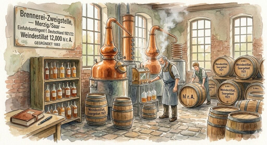 Weindestillat und Alkohol: Die Erwähnung von „unverschnittenem Weindestillat“ und „Edel-Likören“ ist interessant, da das Saargebiet (insbesondere die Region um die Saar und Mosel) eine lange Weinbautradition hat. Diese Destillate waren wertvolle Handelsgüter.